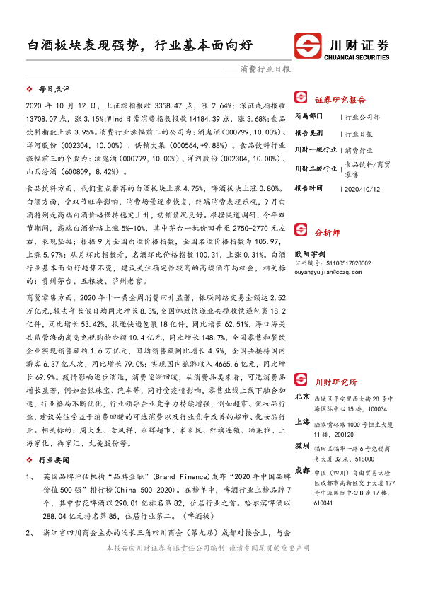 【川财证券】【20201012】消费行业日报:白酒板块表现强势,行业基本面向好-4页