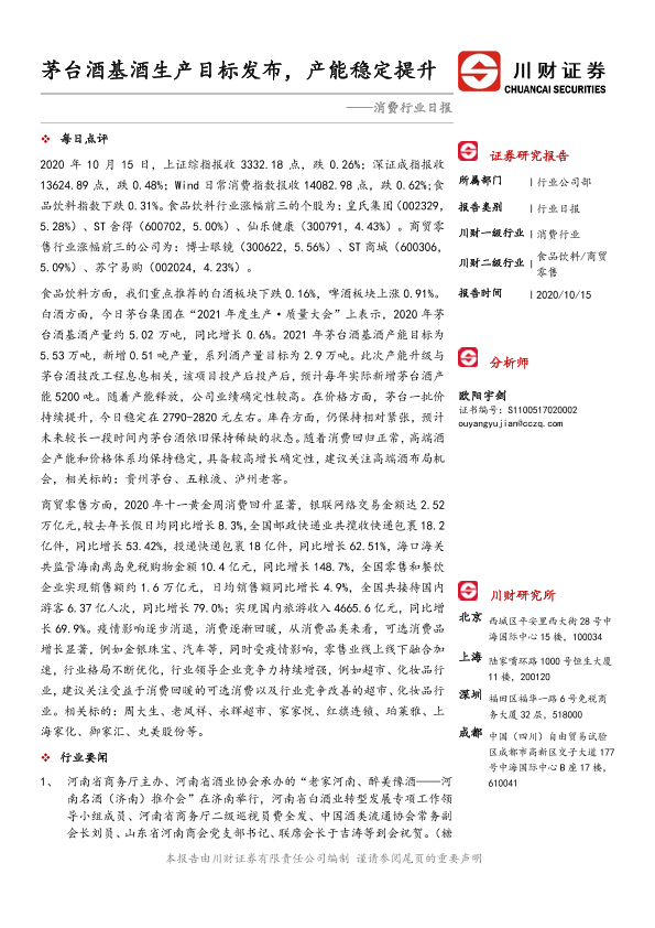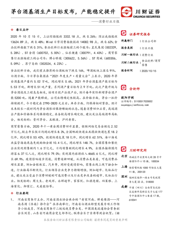 【川财证券】【20201015】消费行业日报:茅台酒基酒生产目标发布,产能稳定提升-4页