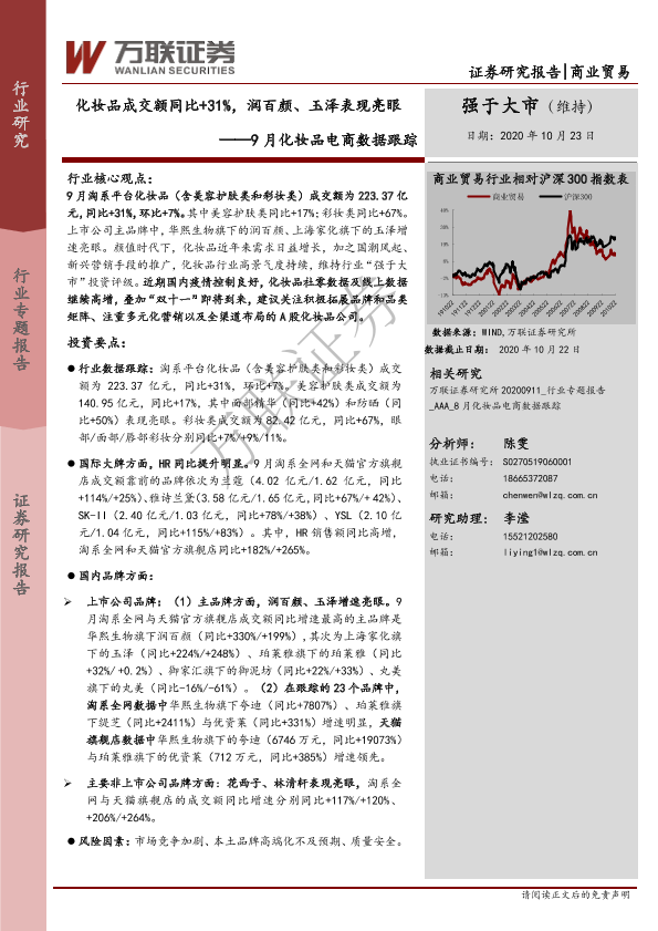 【万联证券】【20201023】9月化妆品电商数据跟踪:化妆品成交额同比+31%,润百颜、玉泽表现亮眼-22页