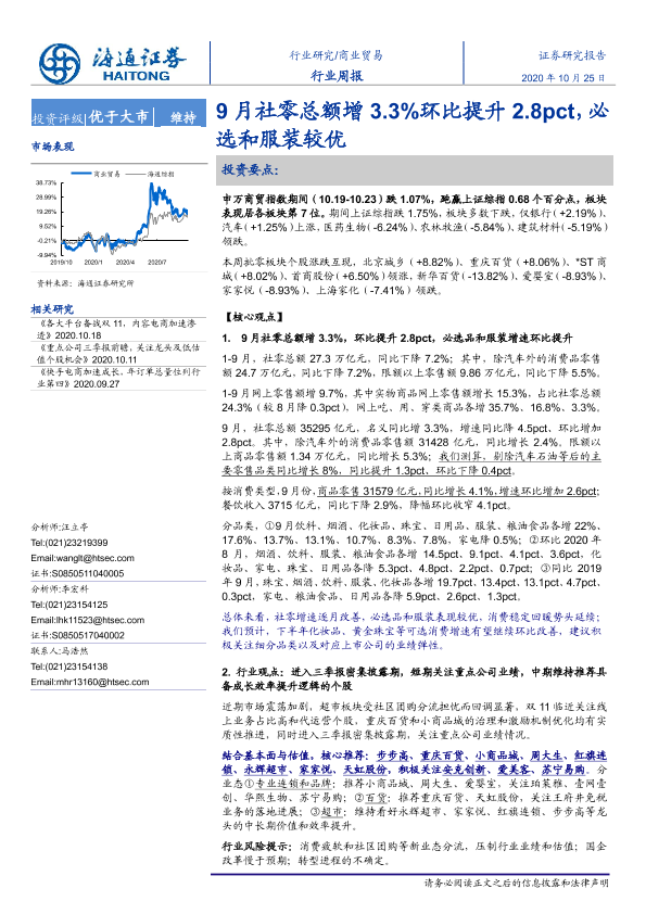 【海通证券】【20201025】9月社零总额增3.3%环比提升2.8pct,必选和服装较优-5页