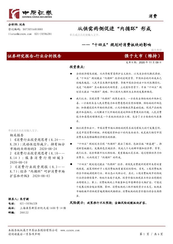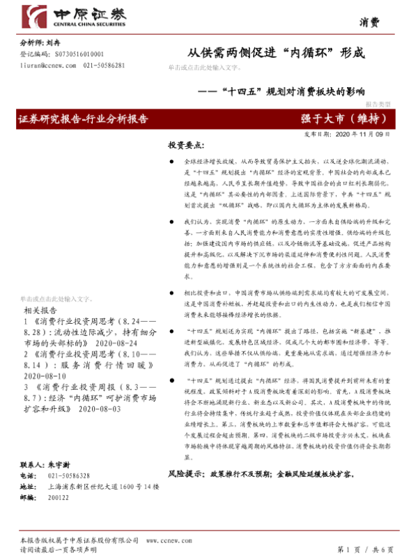 【中原证券】【20201109】“十四五”规划对消费板块的影响:从供需两侧促进“内循环”形成-6页
