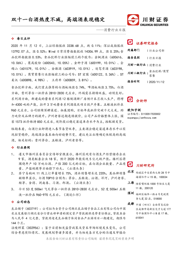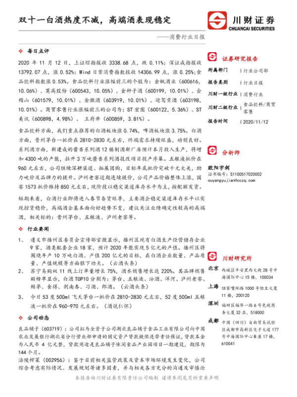 【川财证券】【20201112】消费行业日报:双十一白酒热度不减,高端酒表现稳定-3页