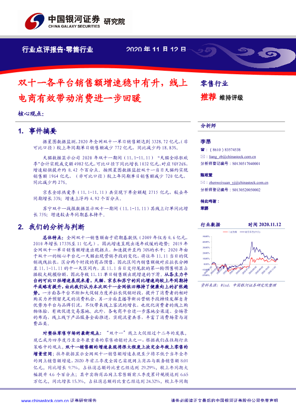 【银河证券】【20201112】零售行业点评报告:双十一各平台销售额增速稳中有升,线上电商有效带动消费进一步回暖-4页