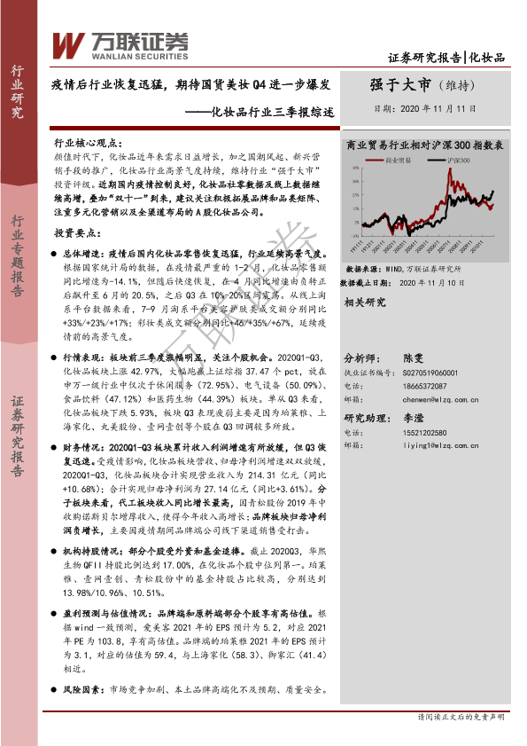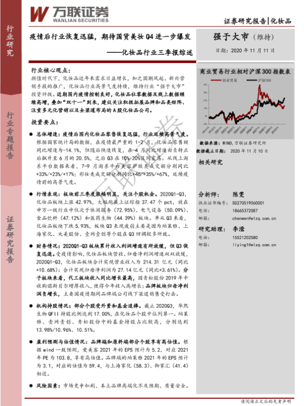 【万联证券】【20201111】化妆品行业三季报综述:疫情后行业恢复迅猛,期待国货美妆Q4进一步爆发-15页