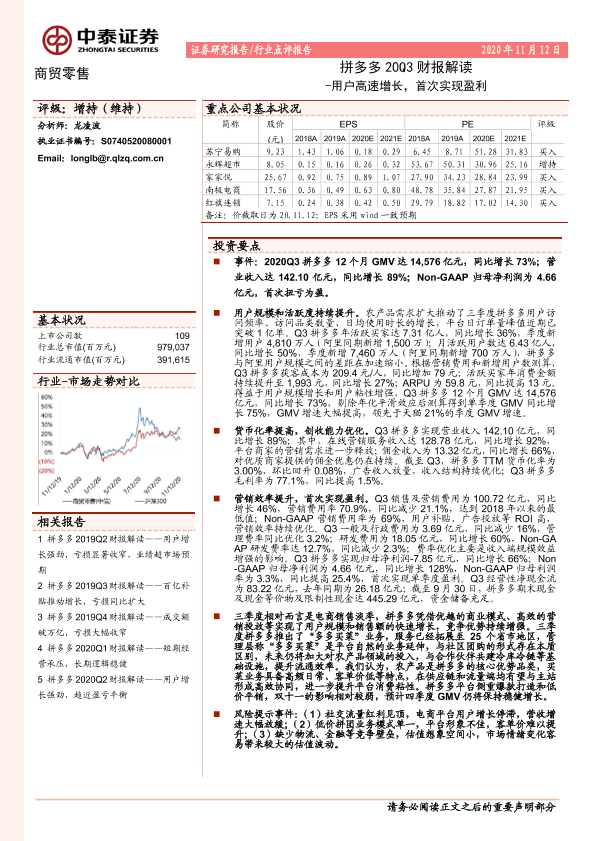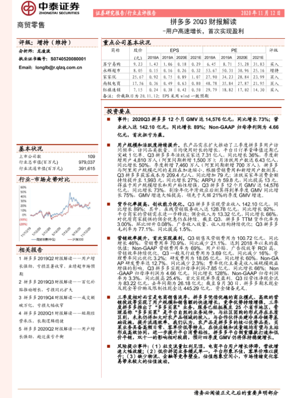 【中泰证券】【20201112】拼多多20Q3财报解读-用户高速增长,首次实现盈利-5页