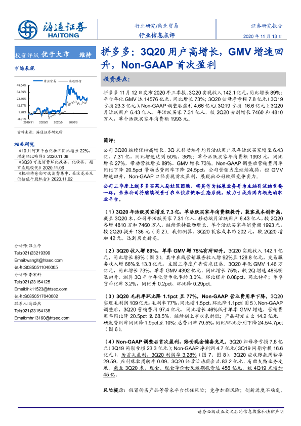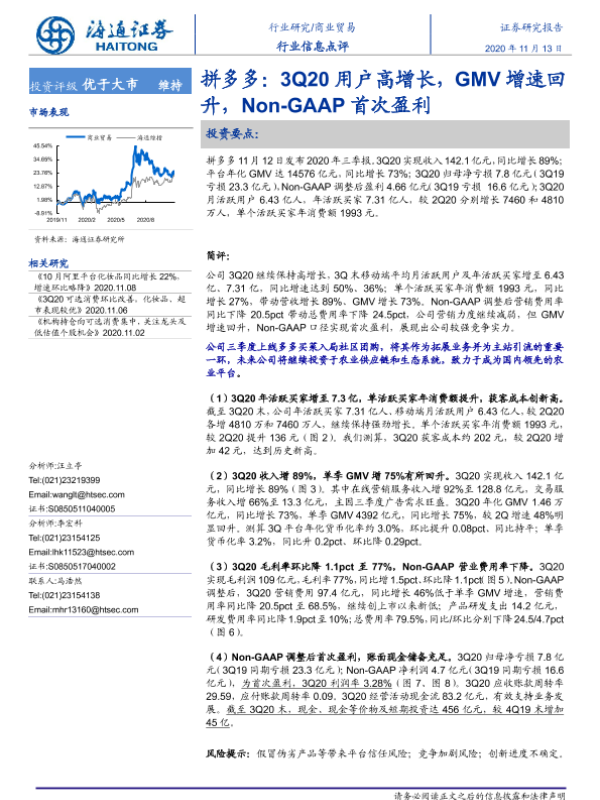 【海通证券】【20201113】拼多多:3Q20用户高增长,GMV增速回升,Non-GAAP首次盈利-4页