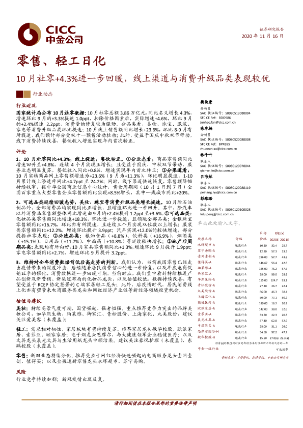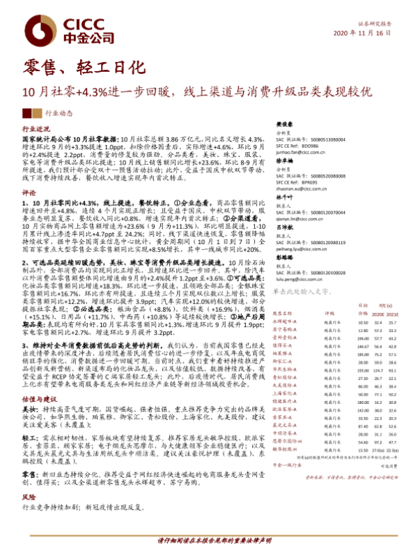 【中金公司】【20201116】零售、轻工日化:10月社零+4.3%进一步回暖,线上渠道与消费升级品类表现较优-8页