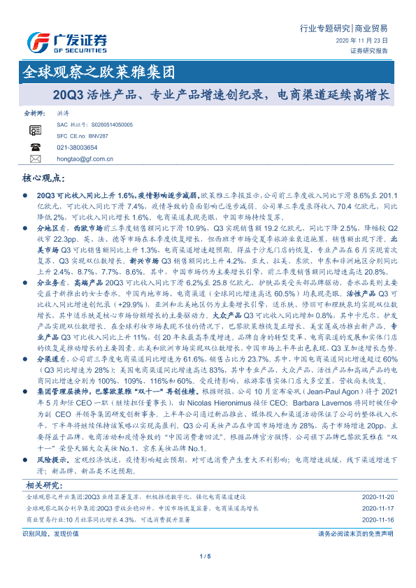 【广发证券】【20201123】全球观察之欧莱雅集团:20Q3活性产品、专业产品增速创纪录,电商渠道延续高增长-5页