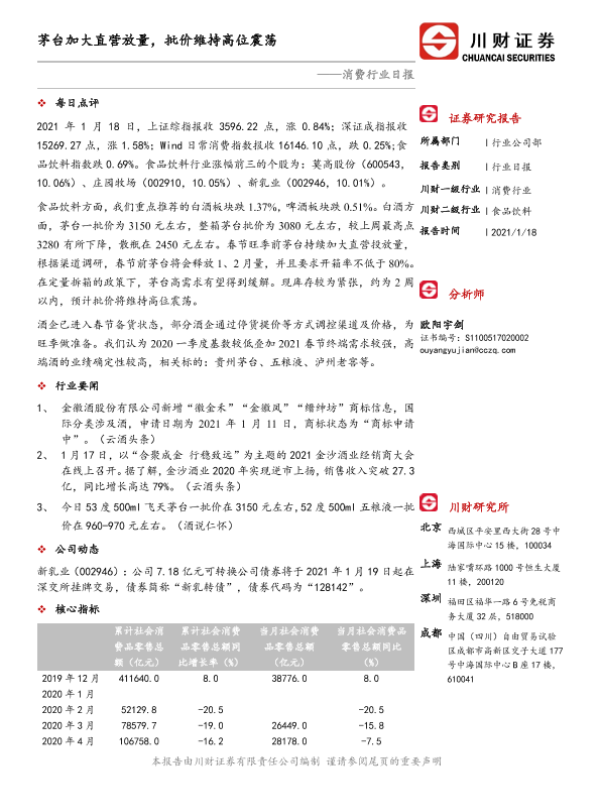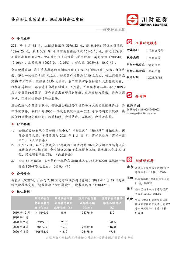 【川财证券】【20210118】消费行业日报:茅台加大直营放量,批价维持高位震荡-3页