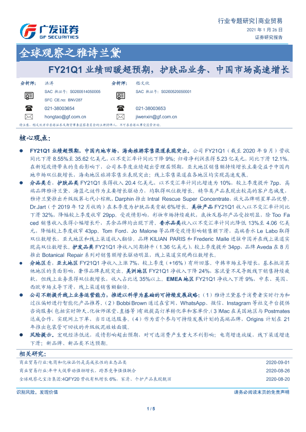 【广发证券】【20210126】全球观察之雅诗兰黛:FY21Q1业绩回暖超预期,护肤品业务、中国市场高速增长-5页