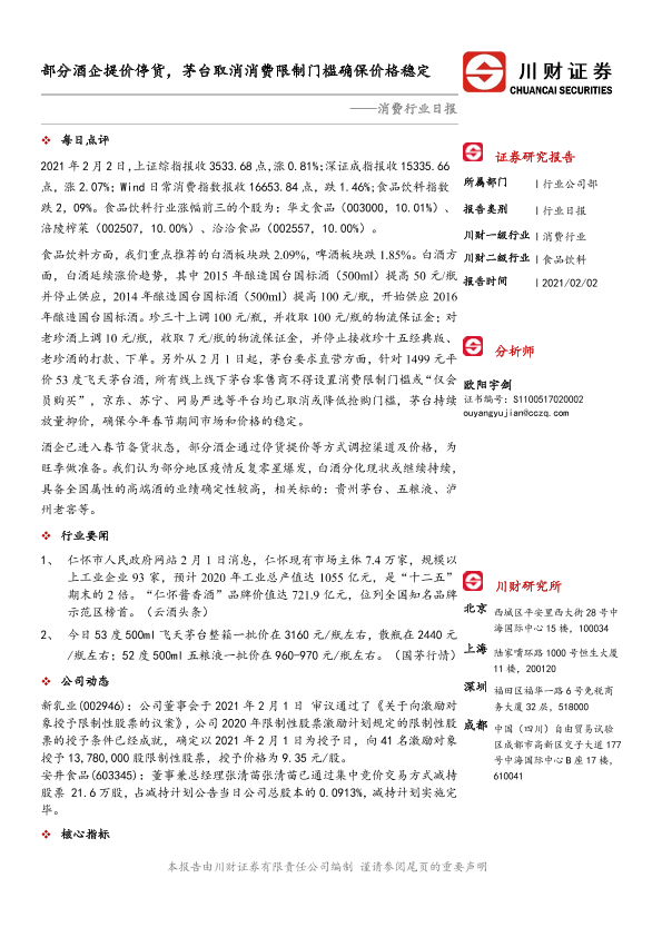 【川财证券】【20210202】消费行业日报:部分酒企提价停货,茅台取消消费限制门槛确保价格稳定-3页