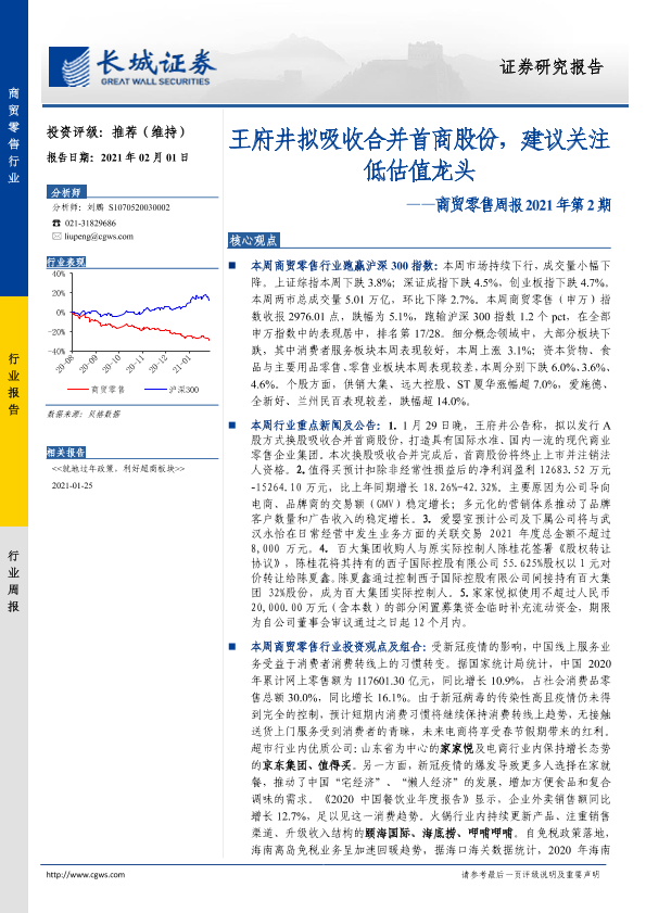 【长城证券】【20210201】商贸零售周报2021年第2期:王府井拟吸收合并首商股份,建议关注低估值龙头-15页