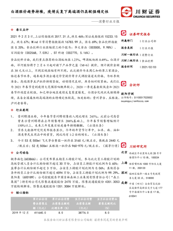 【川财证券】【20210203】消费行业日报:白酒涨价趋势持续,疫情反复下高端酒仍具较强确定性-3页