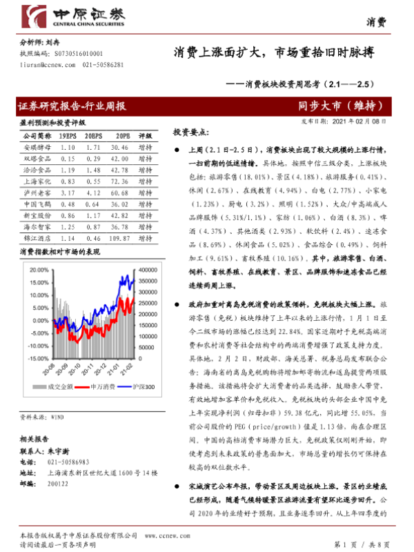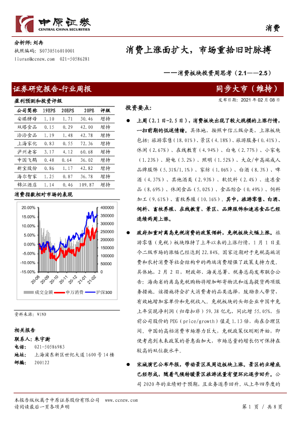 【中原证券】【20210208】消费板块投资周思考:消费上涨面扩大,市场重拾旧时脉搏-8页