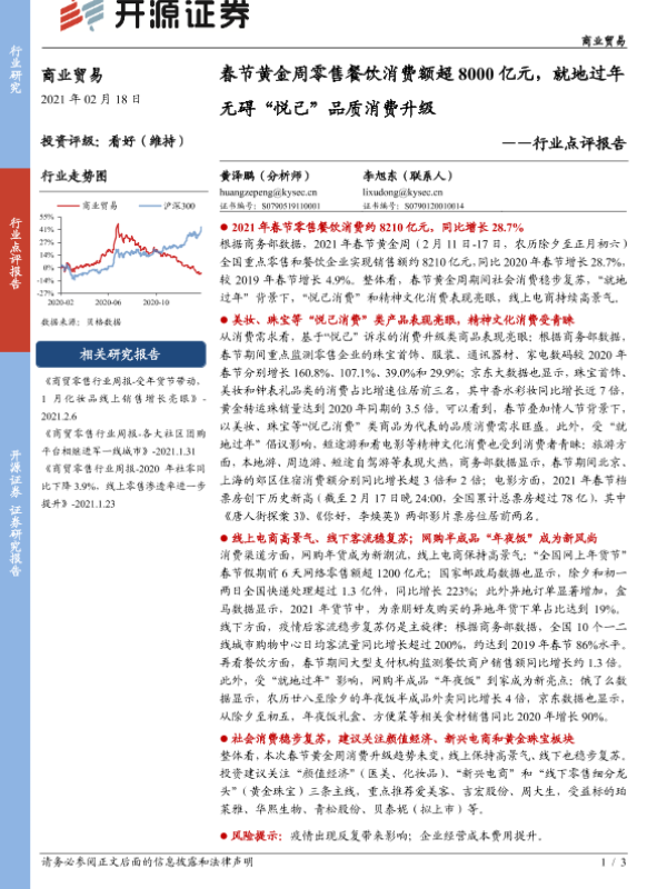 【开源证券】【20210218】春节黄金周零售餐饮消费额超8000亿元,就地过年无碍“悦己”品质消费升级-3页