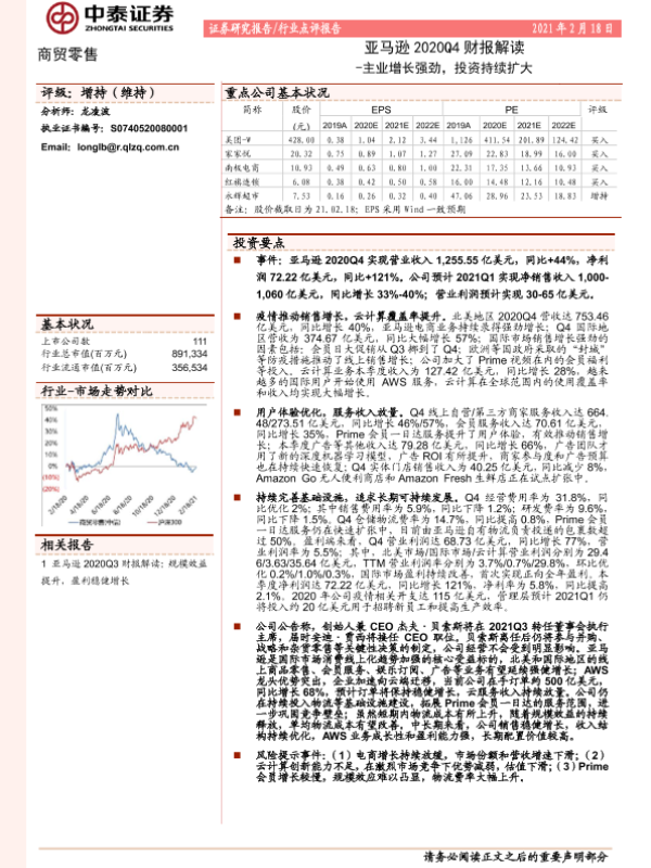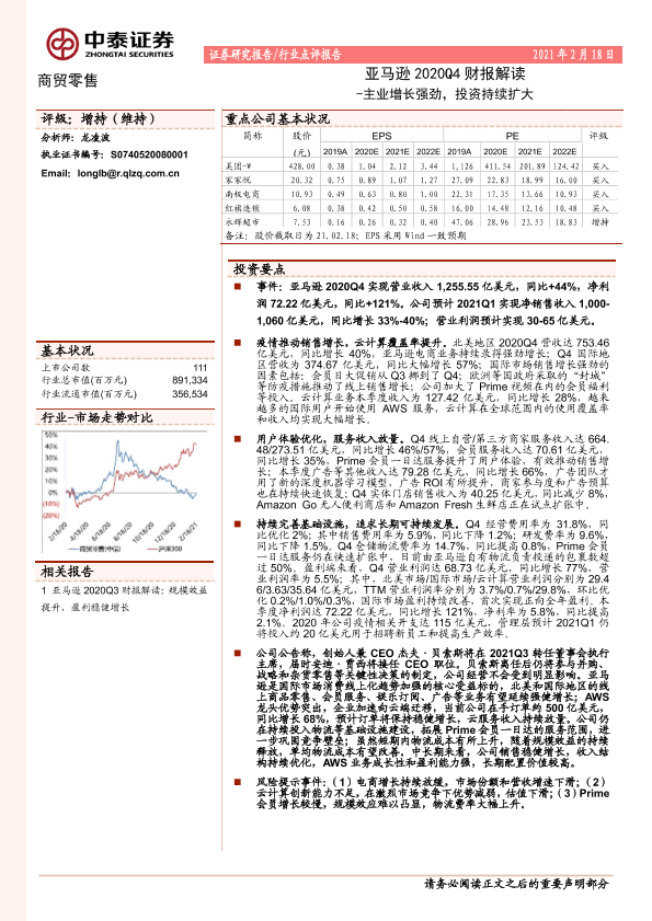 【中泰证券】【20210218】亚马逊2020Q4财报解读:主业增长强劲,投资持续扩大-6页
