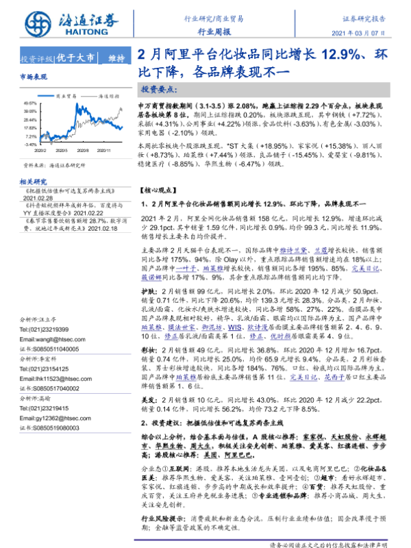 【海通证券】【20210307】2月阿里平台化妆品同比增长12.9%、环比下降,各品牌表现不一-7页