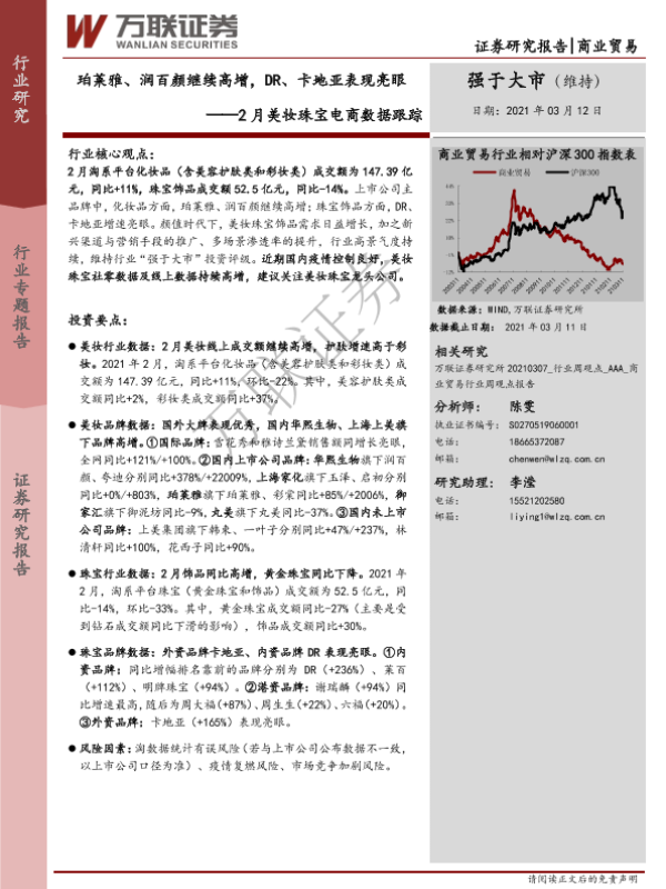 【万联证券】【20210312】2月美妆珠宝电商数据跟踪:珀莱雅、润百颜继续高增,DR、卡地亚表现亮眼-16页