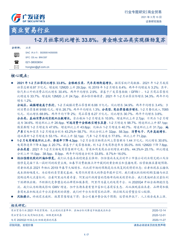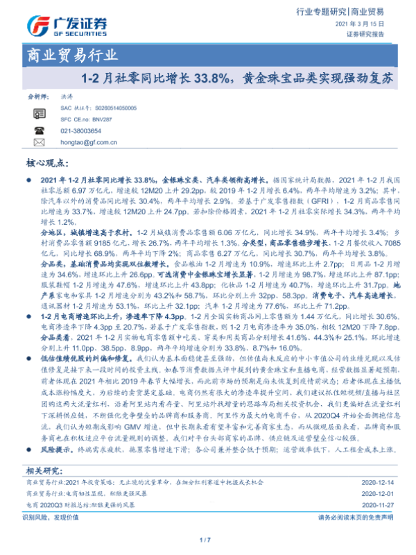 【广发证券】【20210315】1-2月社零同比增长33.8%,黄金珠宝品类实现强劲复苏-7页