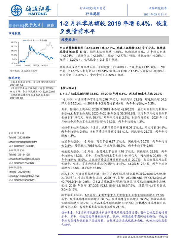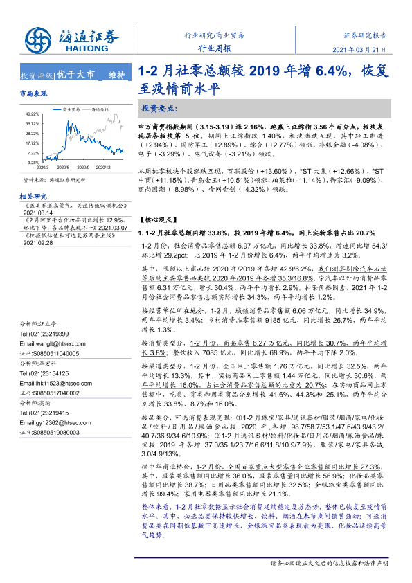 【海通证券】【20210321】商业贸易行业周报:1-2月社零总额较2019年增6.4%,恢复至疫情前水平-6页