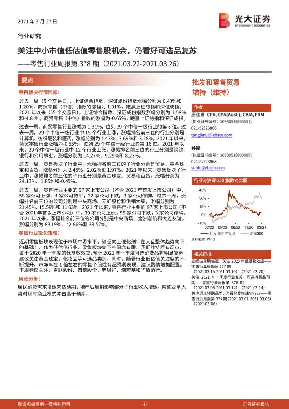 【光大证券】【20210327】零售行业周报第378期:关注中小市值低估值零售股机会,仍看好可选品复苏-8页