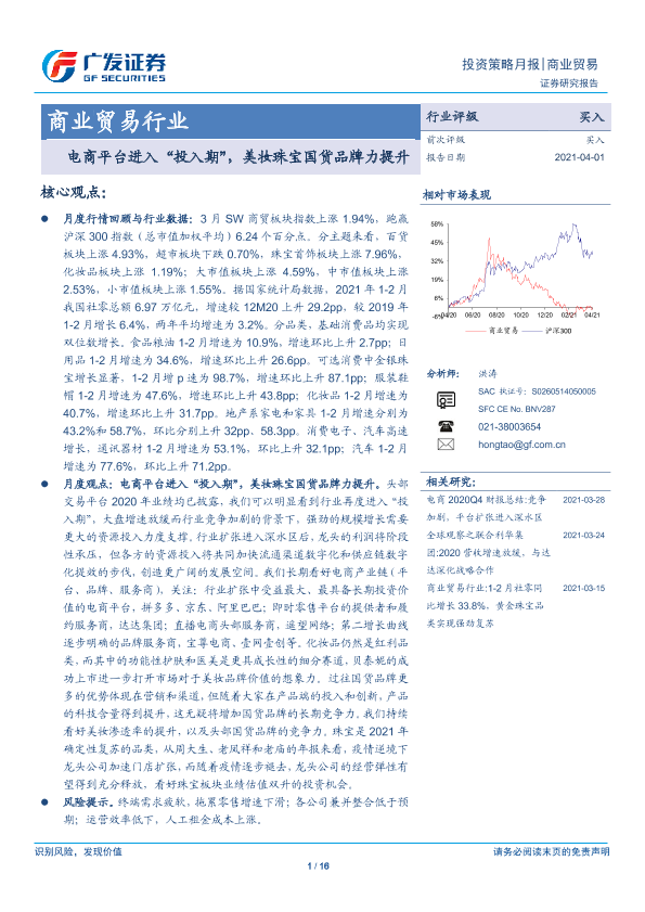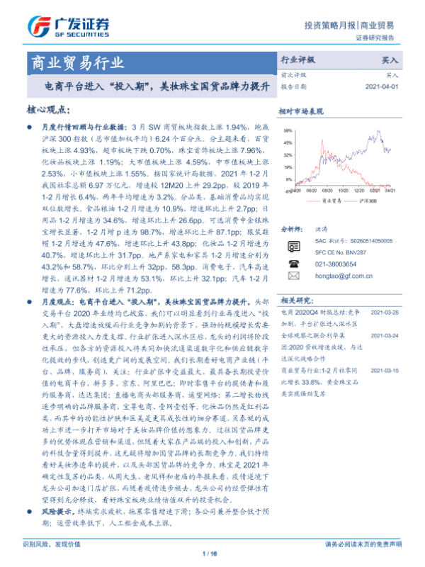【广发证券】【20210401】商业贸易行业投资策略月报:电商平台进入“投入期”,美妆珠宝国货品牌力提升-16页