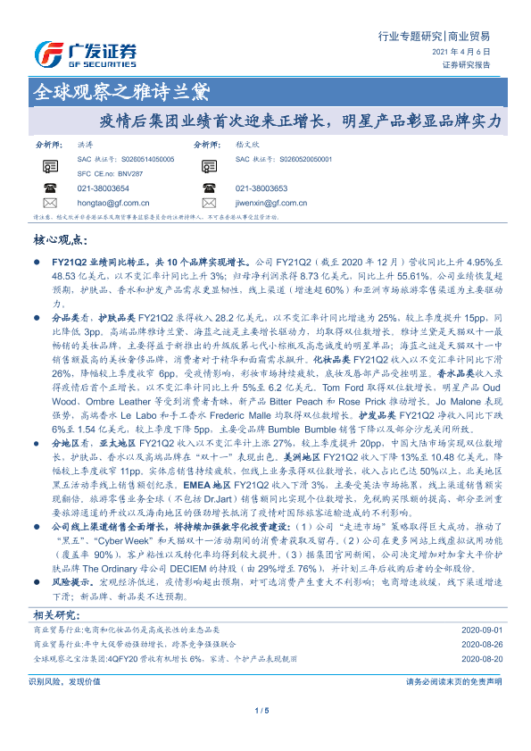 【广发证券】【20210406】全球观察之雅诗兰黛:疫情后集团业绩首次迎来正增长,明星产品彰显品牌实力-5页