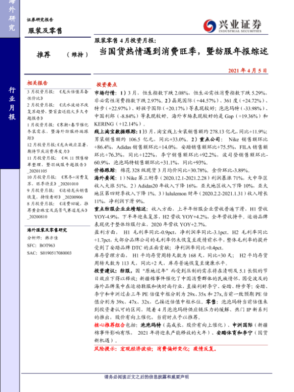 【兴业证券】【20210405】服装零售4月投资月报:当国货热情遇到消费旺季,暨纺服年报综述-21页