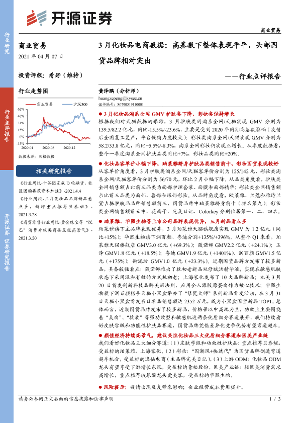 【开源证券】【20210407】3月化妆品电商数据:高基数下整体表现平平,头部国货品牌相对突出-3页