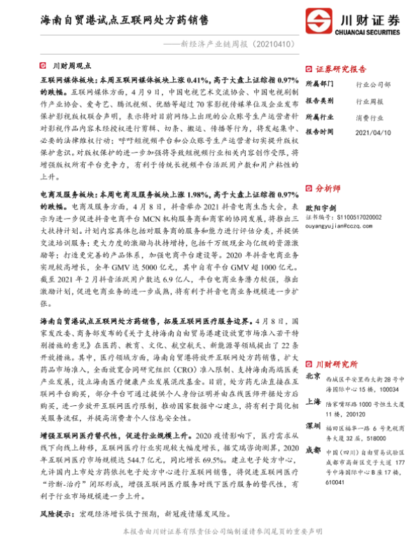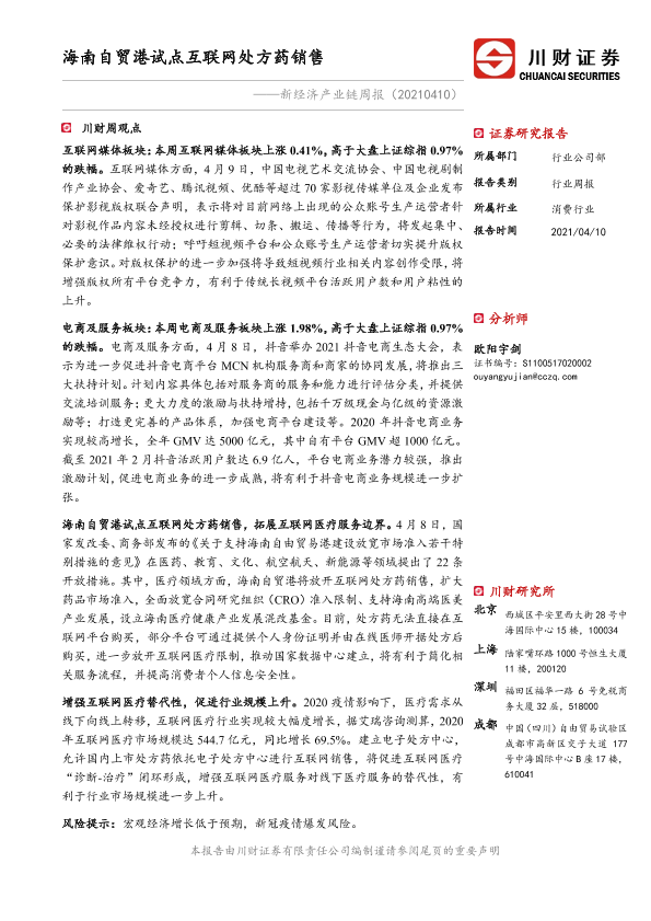 【川财证券】【20210410】新经济产业链周报:海南自贸港试点互联网处方药销售-12页