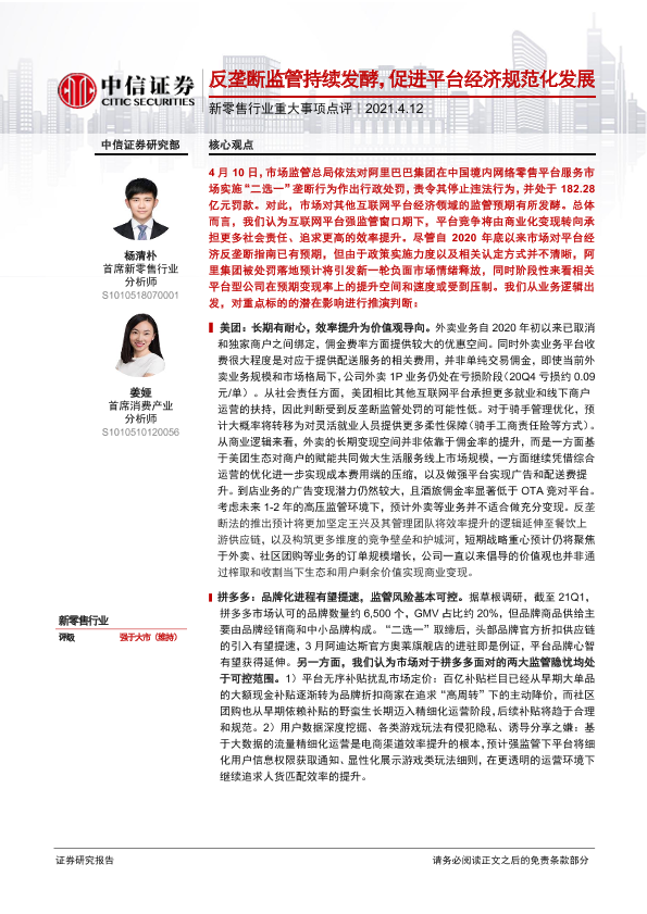 【中信证券】【20210412】新零售行业重大事项点评:反垄断监管持续发酵,促进平台经济规范化发展-3页