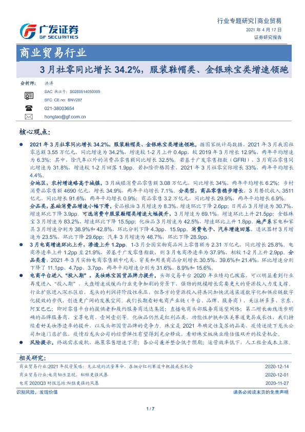 【广发证券】【20210417】3月社零同比增长34.2%,服装鞋帽类、金银珠宝类增速领跑-7页