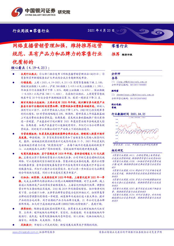 【银河证券】【20210425】零售行业周报:网络直播营销管理加强,维持推荐运营规范、具有产品力和品牌力的零售行业优质标的-31页