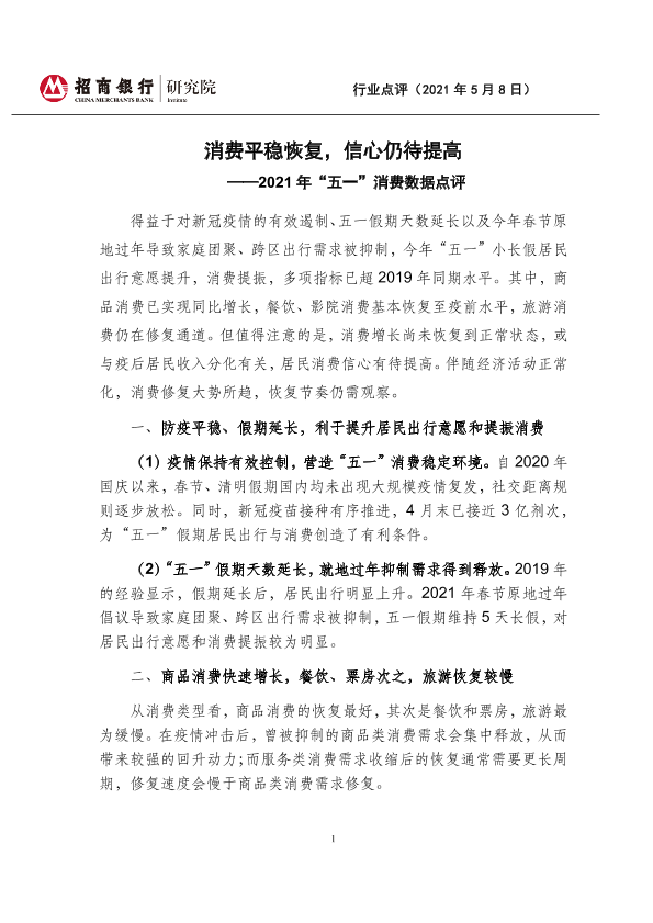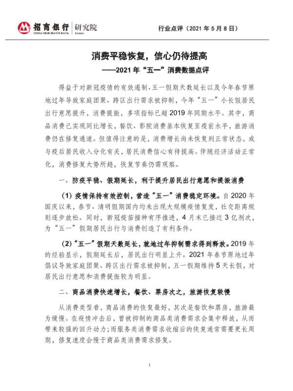 【招商银行】【20210508】2021年“五一”消费数据点评:消费平稳恢复,信心仍待提高-4页