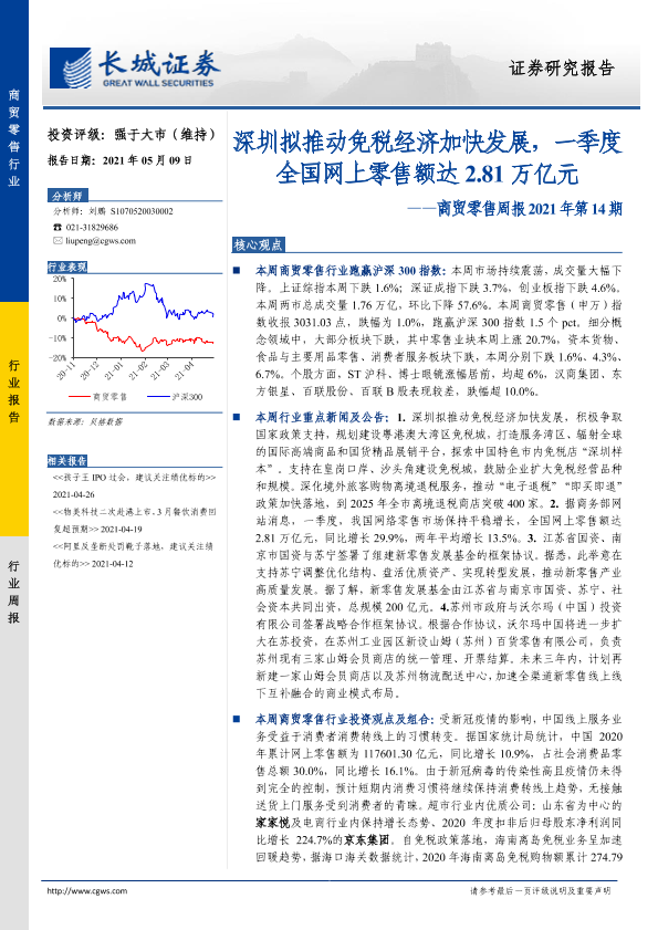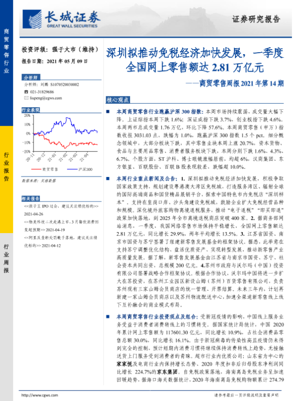 【长城证券】【20210509】深圳拟推动免税经济加快发展,一季度全国网上零售额达2.81万亿元-15页