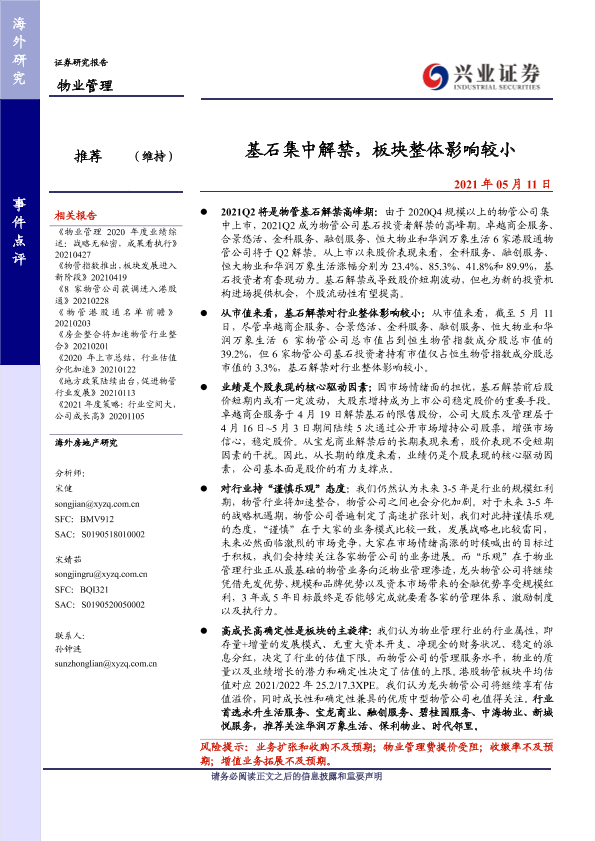 业绩驱动 基石解禁 市场影响 港股通 物业管理