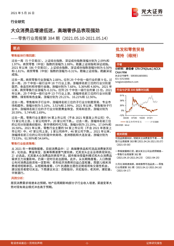 【光大证券】【20210516】零售行业周报第384期:大众消费品增速低迷,高端奢侈品表现强劲-8页