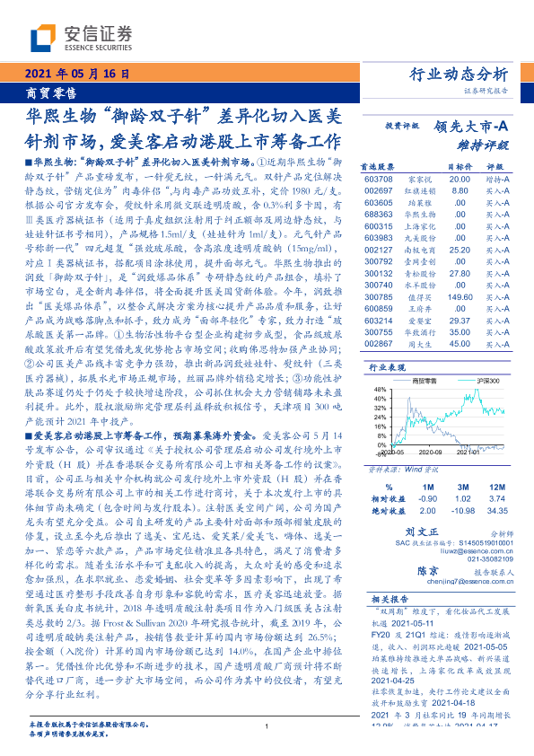 【安信证券】【20210516】商贸零售行业动态分析:华熙生物“御龄双子针”差异化切入医美针剂市场,爱美客启动港股上市筹备工作-15页