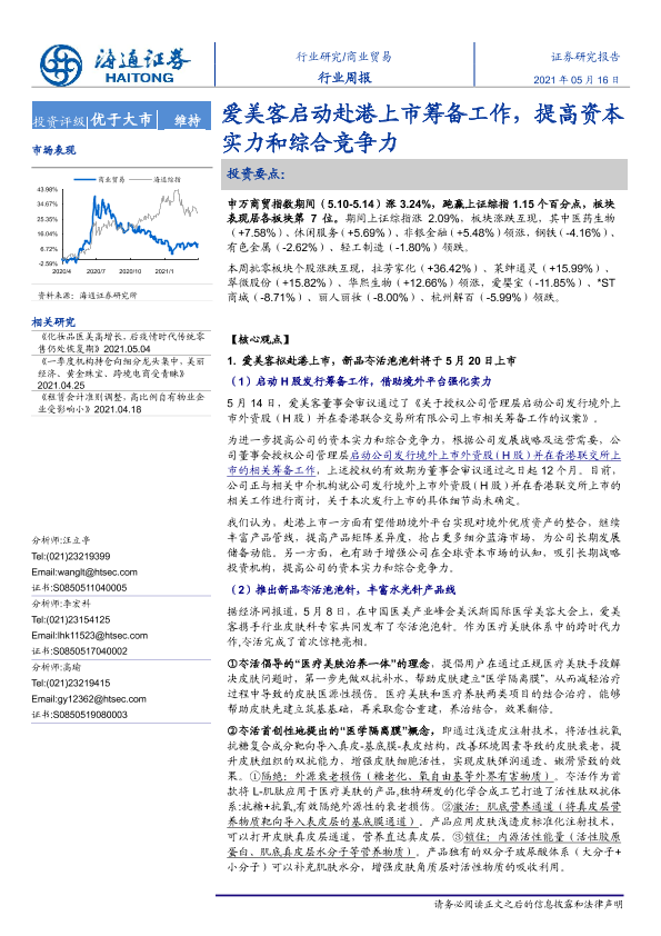 【海通证券】【20210516】商业贸易行业周报:爱美客启动赴港上市筹备工作,提高资本实力和综合竞争力-6页