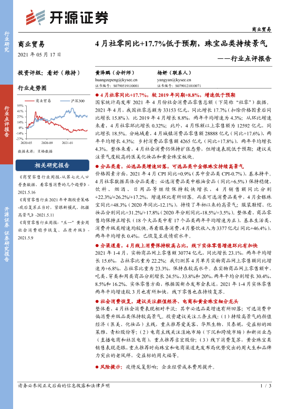 【开源证券】【20210517】4月社零同比+17.7%低于预期,珠宝品类持续景气-3页