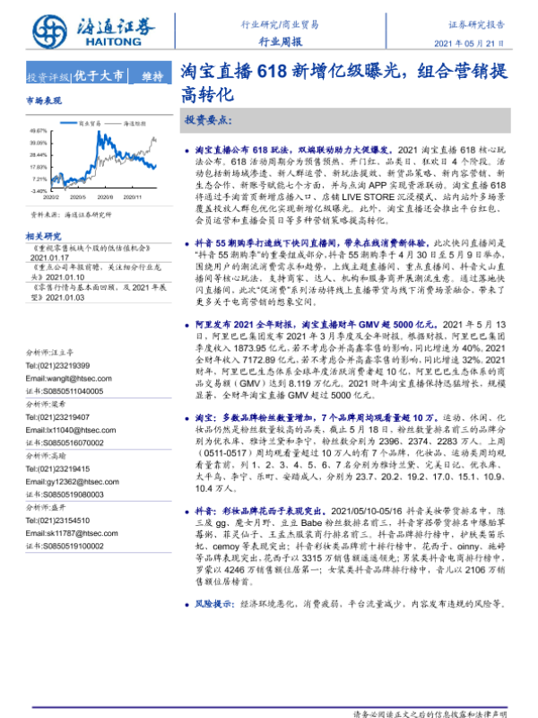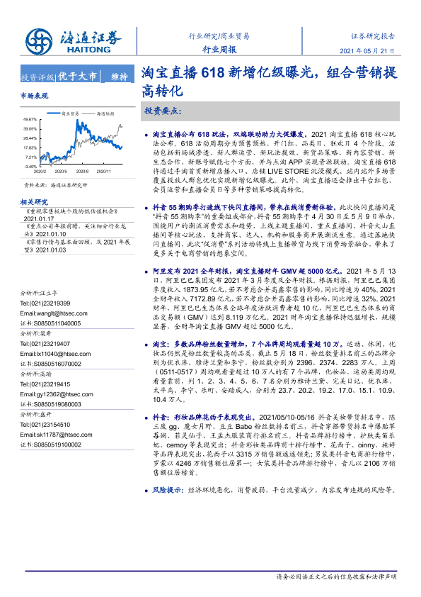 【海通证券】【20210521】商业贸易行业周报:淘宝直播618新增亿级曝光,组合营销提高转化-10页