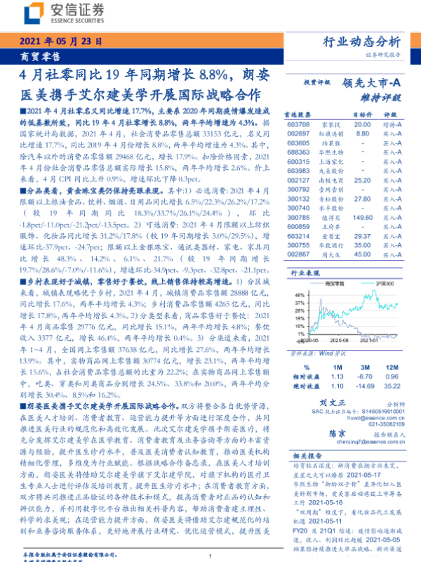 【安信证券】【20210523】4月社零同比19年同期增长8.8%,朗姿医美携手艾尔建美学开展国际战略合作-20页