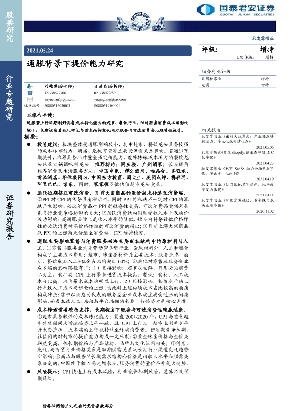 成本转化 提价能力 消费服务 通胀研究 零售业