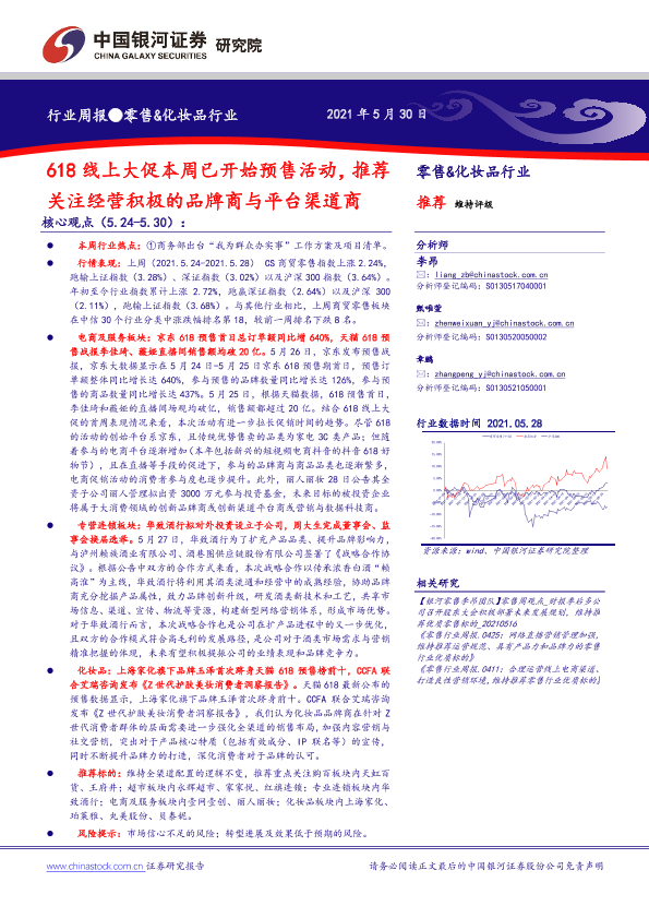 【银河证券】【20210530】618线上大促本周已开始预售活动,推荐关注经营积极的品牌商与平台渠道商-31页