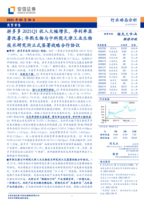 【安信证券】【20210530】商贸零售拼多多2021Q1收入大幅增长,净利率显著改善;华熙生物与中科院天津工业生物技术研究所签署战略合作协议-15页