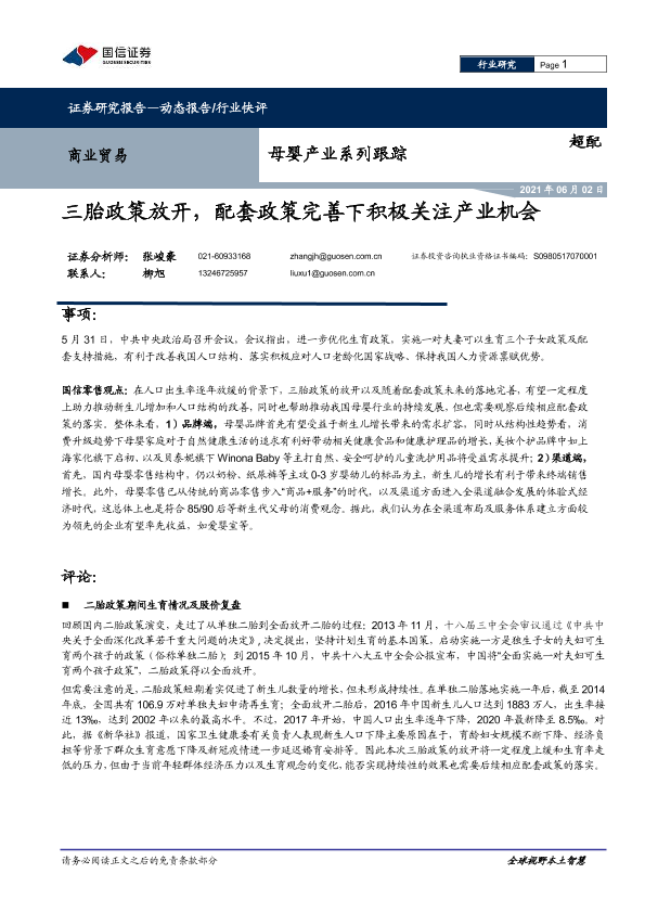 【国信证券】【20210602】母婴产业系列跟踪:三胎政策放开,配套政策完善下积极关注产业机会-10页