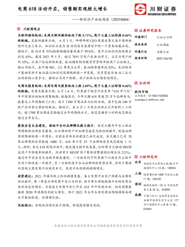 【川财证券】【20210604】新经济产业链周报:电商618活动开启,销售额实现较大增长-12页
