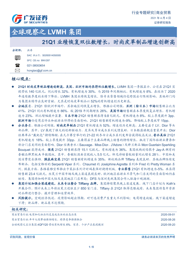 【广发证券】【20210604】全球观察之LVMH集团:21Q1业绩恢复双位数增长,时尚皮革制品增速创新高-5页