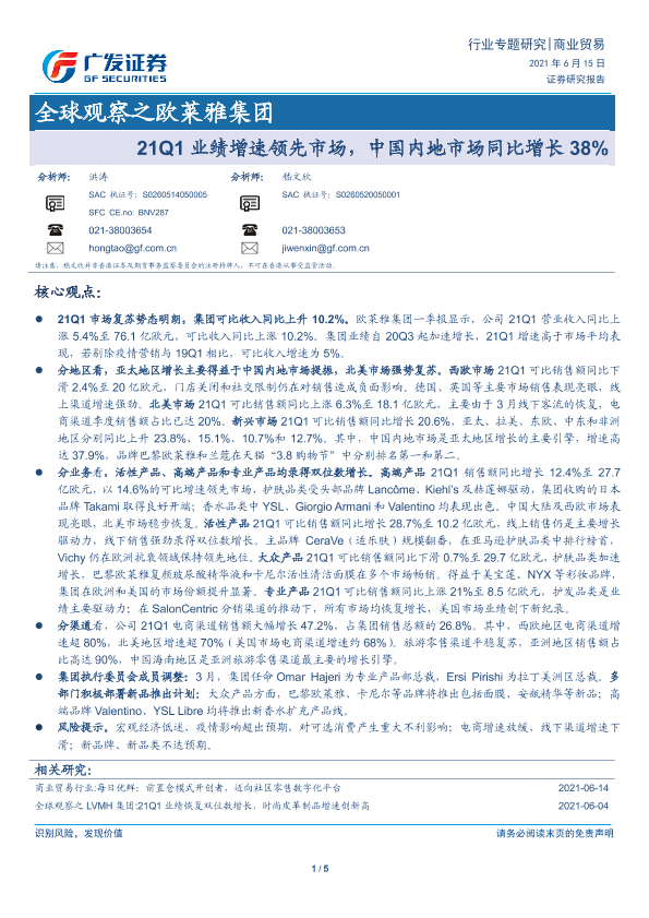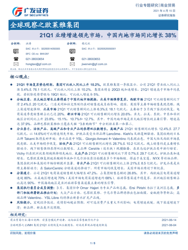 【广发证券】【20210615】全球观察之欧莱雅集团:21Q1业绩增速领先市场,中国内地市场同比增长38%-5页