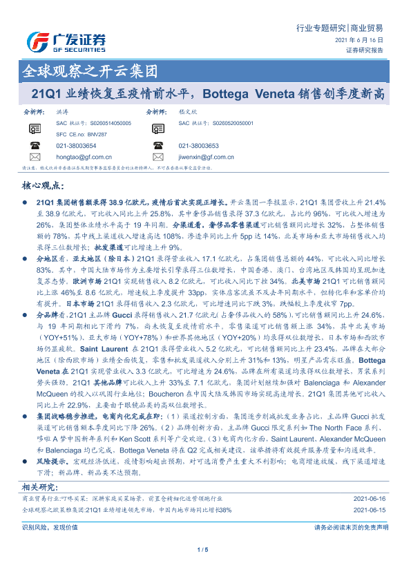 【广发证券】【20210616】商业贸易全球观察之开云集团:21Q1业绩恢复至疫情前水平,Bottega Veneta销售创季度新高-5页
